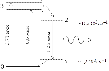 0.9 мкм, но особенно интенсивно на частотах соответствующих λ=0.73;0.8 мкм. Атомы при этом переходят на уровни 3. Затем происходит безизлучательный и быстрый переход на метастабильный уровень 2, где происходит накопление частиц и создается инверсия населенностей