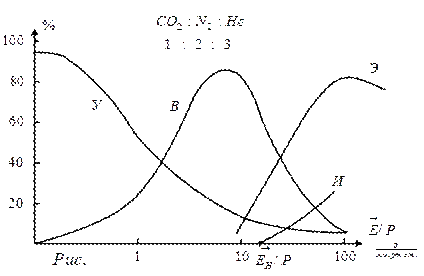 Из рис. видно (кривая В), что доля энергии, выделяемой при электрическом разряде и затрачиваемой на создание инверсии населённости может превышать 80%. Однако это достигается при E<EН (несамостоятельный разряд). Тем не менее, при появлении самостоятельного разряда E=EН эта доля уменьшается, но остаётся ещё достаточно высокой (40-60%).