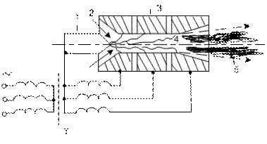 Для этого обычно применяют трех и многофазные конструкции плазмотронов. Схематично конструкция такого плазмотрона в случае 3-х фазного испытания имеет следующий вид, показанный на рис. .