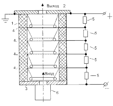 Со стороны впускного отверстия установлен источник заряженных частиц с малой энергией (6). Ускорение частиц происходит в вакуумном пространстве внутри трубки. При этом они движутся вдоль оси трубки в направлении выпускного отверстия. Это отверстие закрыто тонкой металлической фольгой, через которую ускоренные частицы могут проходить. Крышка 2 с выпускным отверстием должна быть заземлена, чтобы на выходе не было электрического поля, которое могло бы изменить энергию и траекторию движения частиц. Таким образом, крышка со впускным отверстием 3 и источник заряженных частиц 6 находятся под высоким напряжением.