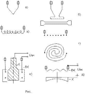 По способу нагрева различают катоды двух видов: с прямым нагревом (рис. а,б,в,г) и с косвенным нагревом (рис е,д). По конструкции различают проволочные (рис. а,в,г), ленточные (рис. б), массивные катоды (рис. е,д) По площади разделяют точечные (рис. а), с малой поверхностью (рис. б), с большой поверхностью (рис. в,г,е,д).