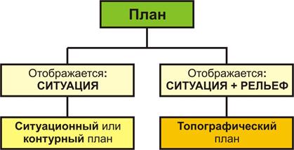 Планы, на которых изображается только ситуация, называются контурными или ситуационными. Если на планах, кроме ситуации, условными знаками показан и рельеф местности, то такие планы называются топографическими.