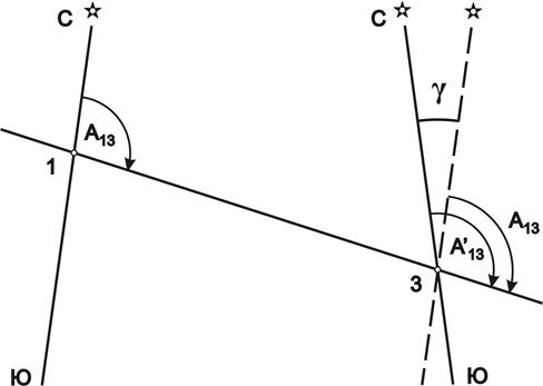 | Рисунок 13.6 – К соотношению между прямым и обратным азимутами линии |