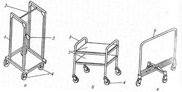 Тележки различаются по конструктивному исполнению, которое определяется размерами, видом и способом транспортирования полуфабрикатов или изделий. Так, тележка (рис. 3а), состоящая из сварного каркаса (1), кронштейна (2), фиксатора (3) маршрутных листов и колес (4), предназначена для перемещения готовых пиджаков на вешалках и на кронштейне (2).