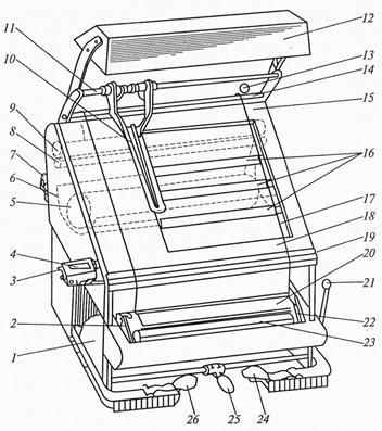 Станок имеет корпус (рис. 5), на фронтальной части которого установлена смотровая доска (15). Доска имеет выполненное из стекла окно (17), которое подсвечивается снизу люминесцентными лампами (16). Сверху со стороны работающего (по отношению к материалу) материал (18) освещается люминесцентными лампами, установленными в светильник (12). Рулон (5) материала размещается на скалке, вращающейся в двух опорах (7), установленных на шарикоподшипниках, или укладывается в желоб (6). Линейка (19) служит для визуального контроля ширины материала, счетчик (4) — для измерения длины. При нажатии на рычаг (3) происходит установка показаний счетчика (4) в исходное состояние. Педаль (24) служит для перемещения материала сверху вниз, а при нажатии на педаль (26) материал (18) перемещается в обратном направлении, т.е. снизу вверх.