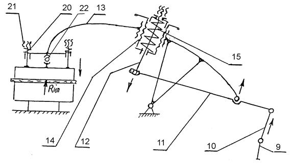 Рычаг 9 имеет сдвоенную конфигурацию. Опорой рычага служит шарнирная ось, установленная снизу в корпусной раме пресса. Сверху к рычагу 9 шарнирно присоединен рычаг 10, который в свою очередь образует шарнирную пару с двуплечим рычагом 11. Последний располагается внутри корпуса главного рычага 13 и соединен с ним шарнирной осью. И, наконец, сам главный рычаг установлен на шарнирной оси корпусной рамы.