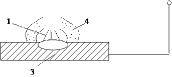 Электрическая дуга 1, горит между электродом 2 и свариваемым изделием 3 в газообразной среде 4. газошлаковая расплавленного металла 5.