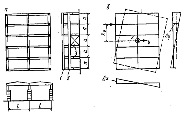 Покрытие здания из железобетонных плит, соединенных сваркой закладных деталей с замоноличиванием швов, представляет собой жесткую в своей плоскости горизонтальную связевую диафрагму. Колонны здания, объединенные горизонтальной связевой диафрагмой в поперечные и продольные рамы, работают как единый пространственный блок. Размеры такого блока в плане определяются расстояниями между температурными швами (рис.1, а).