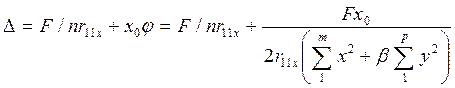 В каркасном здании из типовых элементов с регулярным шагом колонн и постоянной жесткостью сечений колонн центр жесткости блока (т. е. точка приложения равнодействующей реактивных сил при поступательном перемещении блока) совпадает с его геометрическим центром. Если поместить начало координат в этом центре и принять что х - координата поперечной рамы, а у продольной рамы (рис,1, б), то, приложив к поперечной раме с координатой хо силу F, можно определить перемещение этой рамы. Перемещение блока от силы F - поступательное, а от момента