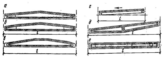 Рис.6. Конструктивные схемы балок покрытий:а - двускатных с очертанием верхнего пояса; а - прямолинейным; б - то же ломанным; в - то же криволинейным; г – односкатных с параллельными поясами ; д - то же с ломаным нижнем поясе; е – плоских