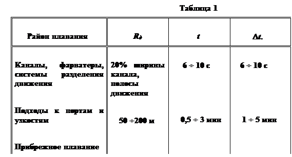 условий плавания. В табл.1 представлены требования МАМС к величине предельной погрешности места Rд (для Р = 0,95), допустимому времени производства обсервации t и допустимым интервалам между обсервациями Dt. Данные этой таблицы приближенно соответствуют результатам расчета по приведенным ниже формулам для определения допустимой СКП места и дискретности обсерваций.