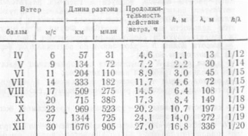 По происхождению волны подразделяются на ветровые, приливо-отливные, анемобарические, волны землетрясения (цунами) и корабельные. Наиболее распространенными являются ветровые волны. Различают три типа волнения: ветровое, зыбь и смешанное. Ветровое волнение — развивающееся, оно находится под непосредственным воздействием ветра в отличие от зыби, представляющей собой инерционное волнение, или волнение, вызванное штормовым ветром, дующим в удаленном районе. Профиль ветровой волны не симметричен. Ее подветренный склон круче, чем наветренный. На вершинах ветровых волн образуются гребни, верхушки которых под действием ветра заваливаются, образуя пену (барашки), а при сильном ветре срываются. Направление ветра и направление ветровых волн в открытом море, как правило, совпадают или разнятся на 30—40°. Размеры ветровых волн зависят от скорости ветра и продолжительности его воздействия, длины пути ветровых потоков над водной поверхностью и глубины данного района (табл. 7.1).