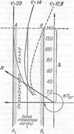 3. Через значение λ=140 м проводится горизонтальная линия. Через точки пересечения горизонтальной линии с кривыми τ'1 и τ'2 проводятся вертикальные линии АА1 и ВВ1, которые и определяют зону тяжелой бортовой качки. Вертикальная линия, проведенная через значение τ'/=14 = T2, характеризует наиболее тяжелую резонансную качку (рис. 7.6). Подобным же образом может быть определена зона тяжелой килевой качки. Если конец вектора скорости (в масштабе диаграммы) находится на вертикальной прямой, характеризующей резонансную качку, корабль будет испытывать особенно тяжелую качку, для уменьшения влияния которой маневрируют курсом и скоростью(2). В тех случаях, когда изменение курса и скорости не приводит к желаемому результату, что особенно характерно для малых кораблей, необходимо прибегнуть к штормованию. Штормованием называется особый вид плавания, когда корабль вследствие сильного влияния волнения удерживается на месте или следует наиболее благоприятным курсом и небольшой скоростью относительно ветра и фронта волны.