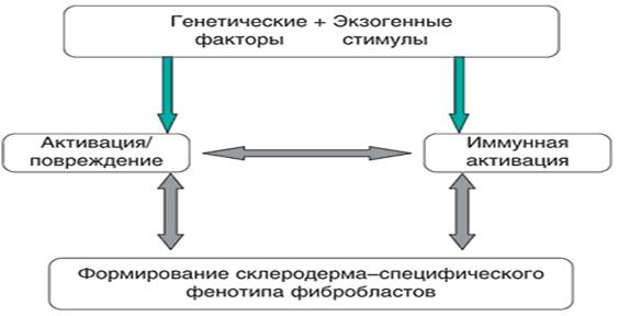 Изменения метаболизма соединительной ткани с повышением коллагено- и фиброзообразования определяют по существу нозологическую специфику заболевания. Выявлены фенотипически устойчивая гиперактивность фибробластов, структурные и функциональные аномалии клеточных мембран и рецепции, что позволяет предполагать также системную мембранную патологию. Обсуждается возможность первичного, или индуцированного, метаболического дефекта фибробластов, реализующегося при воздействии дополнительных экзогенных стимулов. Таким дефектом может быть недавно идентифицированный у Tsk-1 мышей (экспериментальная модель ССД) мутантный ген фибриллина, что нашло косвенное подтверждение при обследовании полуизолята индейского племени в Оклахоме, у которого распространенность ССД в 50 раз выше, чем в популяции.