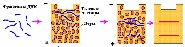 Рис. 3. Схема фракционирования фрагментов ДНК по размерам методом гельэлектрофореза