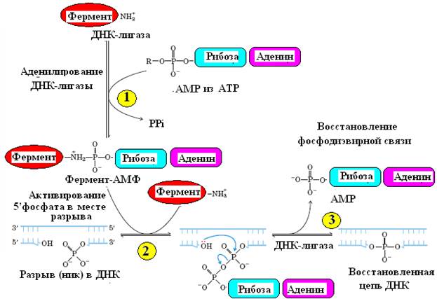 ДНК-лигазы катализируют ковалентное сшивание цепей ДНК в дуплексе (рис. 6). Они образуют фосфодиэфирные мостики между 5’-фосфатной и 3’- гидроксильной группами соседних дезоксинуклеотидов в местах разрывов ДНК или между двумя молекулами ДНК. Для образования этих связей лигазы используют энергию гидролиза АТФ.