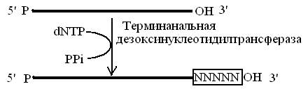 Терминальная трансфераза (терминальная дезоксинуклеотидил трансфераза) катализирует присоединение мононуклеотидов к 3'-OH концу ДНК-затравки, в процессе присоединения мононуклеотида отщепляется пирофосфат. Одноцепочечная ДНК служит наиболее эффективной затравкой.
