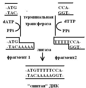 Рис. 15. Создание «липких» концов и сшивка фрагментов ДНК коннекторным методом