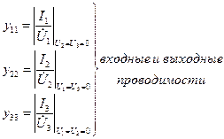 Симметрия приведенной выше схемы определяет равенство собственных и взаимных проводимостей матрицы со стороны акустических входов, т.е. y11=y22, y12=y21, y13=y31, y23=y32. Противоположность направлений излучения поверхностной волны из акустических выходов 1 и 2 отражается разными знаками в элементах взаимных проводимостей.