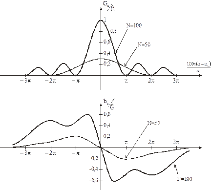 Частотные зависимости активной и реактивной составляющих проводимостей излучения преобразователя для двух значений N приведены на следующем рисунке:
