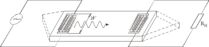 Чаще всего линия задержки ПАВ (ЛЗ ПАВ) представляет собой пьезокристаллическую пластину, на поверхности которой наносится (методом напыления в вакууме) два встречно-штыревых преобразователя, служащие для преобразования подводимой к ним электромагнитной энергии в ПАВ и наоборот (см. рисунок 12).