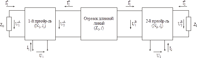 Входной и выходной преобразователи ЛЗ ПАВ представлены эквивалентными электрическими шестиполюсниками, характеризуемыми матрицами Y-параметров. Пьезоэлектрический звукопровод между входными и выходными преобразователями представлен на схеме электрическим аналогом - отрезком длинной линии с характеристическим сопротивлением Z0 и длинной l. Отсутствие отражения от краев пьезоподложки учтено тем, что внешние акустические входы преобразователей нагружены на характеристическое сопротивление упругой среды Z0.