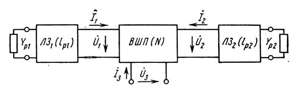 Эквивалентная схема одновходового резонатора представлена эквивалентной схемой ВШП акустические выходы которого нагружены через отрезки звукопроводов нагружены на входные проводимости отражательных решеток YP1 и YP2.