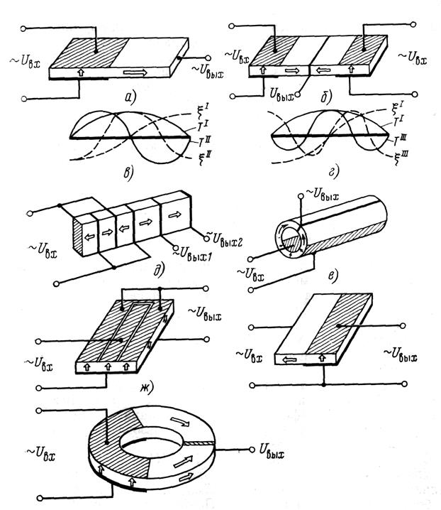 Одна из первых конструкций высоковольтных ПТ показана на рис. 1,а. Коэффициент трансформации такого ПТ достигает 100 в нагруженном состоянии и более 1000 при отсутствии нагрузки. На этом же рисунке даны распределение внутренних механических деформаций и смещение отдельных частей пьезоэлемента; такие ПТ эффективно работают как на основной, так и на второй гармонике собственного механического резонанса.