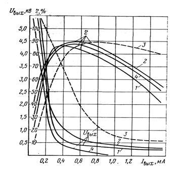 | Рисунок 30 – Зависимость КПД и выходного напряжения ПТ от тока нагрузки: 1- ЦТС-23 2- ЦТССт-5 3- ЦТБС-4 4- ПКР-8 |