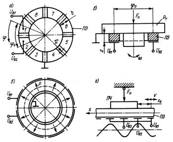 | Рисунок 48 – Упрощенные конструкции ПЭД волнового типа: вращательного движения с аксиальной (а) и радиальной (б) поляризацией, их разрез (в), линейный ПЭД (г). |