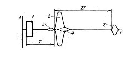 Рассмотрим импульсный отклик ЛЗ. В качестве базы для ориентировочного отсчета задержки примем сигнал 1, соответствующий по временному положению электрическому сигналу, поступающему на входной преобразователь. Физическая природа возникновения незадержанного сигнала 1 обусловлена прямым прохождением (наводкой) электрического сигнала со входа на выход ЛЗ. Основной задержанный сигнал 2 смещен по отношению к входному сигналу на t=L/V. Сигнал 3 обусловлен переотражением ПАВ, и имеет задержку относительно 1 2T и относительно входного сигнала 3T.