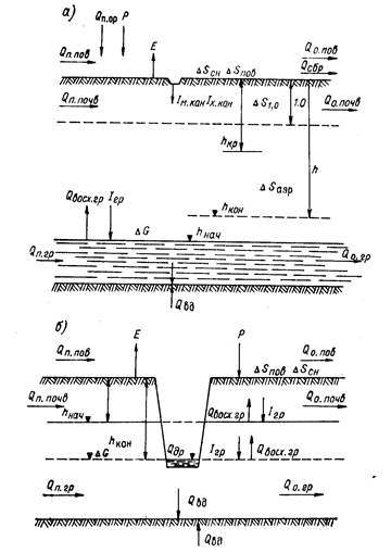 Рис.4.2. Схема водного баланса и влагообмена между зоной аэрации и грунтовыми водами сельскохозяйственного поля на оросительных (а) и осушительно-увлажпительных (б) системах.