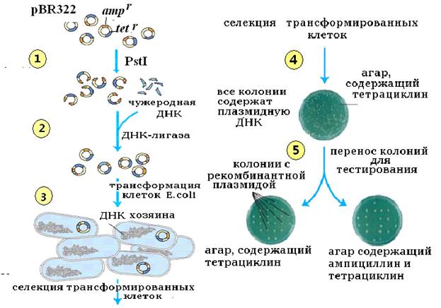 Информация по клонированию рекомбинантных ДНК с помощью плазмидного вектора pBR322, изложенная в данном разделе, суммирована в виде схемы эксперимента и представлена на рисунке 20.