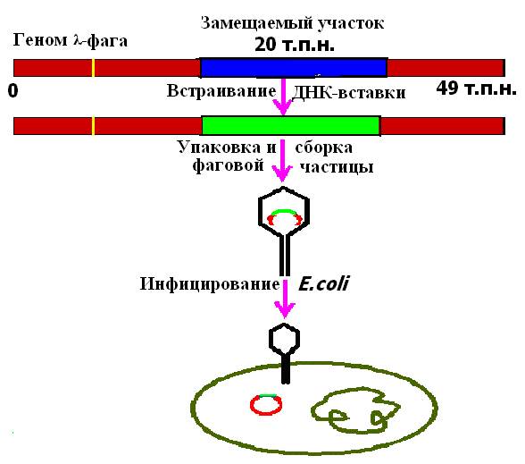 Рис. 24. Использование векторов на основе фага λ для клонирование фрагментов ДГК в клетках Ε. сoli.