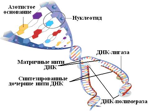 ДНК клетки, приступающая к делению, претерпевает кардинальные изменения: двойная спираль раскручивается, цепи расходятся. На каждой цепи начинается синтез комплементарных полинуклеотидов, на одной — непрерывный, на второй прерывистый. Его катализирует фермент под названием ДНК-зависимая ДНК-полимераза; другой фермент, ДНК-лигаза, сшивает полинуклеотидные фрагменты в непрерывную цепь. Так из одной молекулы ДНК образуются две.