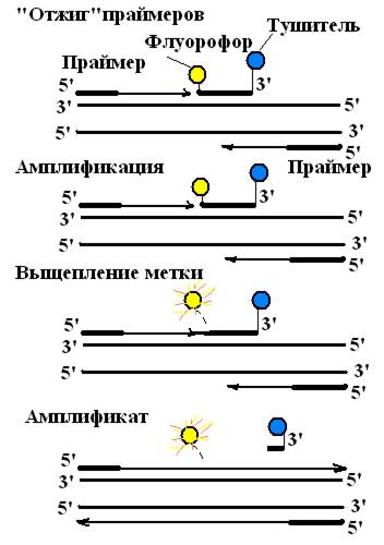 Рис. 46. Схема, представляющая систему использования флуорфоров при проведении ПЦР в реальном времени