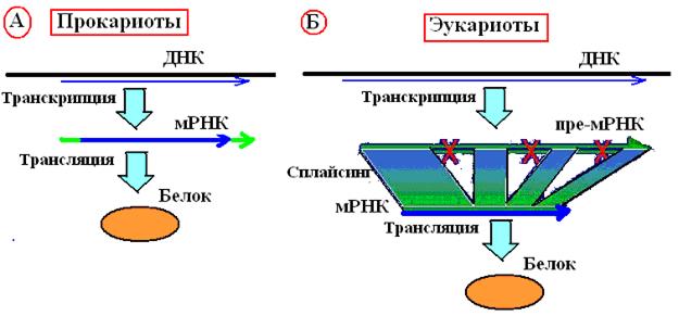 Структура гена эукариот сложнее (рис. 53, Б). Из длинной пре-мРНК (первичный транскрипт) удаляются (вырезаются) интроны (insertion sequences, вставочные последовательности), а оставшиеся экзоны сшиваются в единую нить. Из пре-мРНК в результате процесса, который получил название сплайсинг, получается зрелая мРНК. Потом происходит трансляция зрелой мРНК, в результате образуется белок..