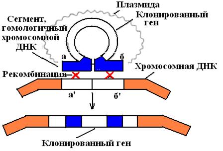 Ген встроен в середину клонированного в плазмиде участка ab, гомологичного участку a'b' в хромосомной ДНК. В результате двойного кроссинговера (Χ-Х) клонированный ген оказывается в составе хромосомы.