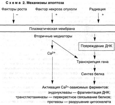 Механизмы возникновения апоптоза различны и зависят от характера воздействия и типа клеток, однако последовательность событий, которые приводят к конечному результату, до конца не выяснена. Вместе с тем ряд механизмов уже установлен (схема 2).