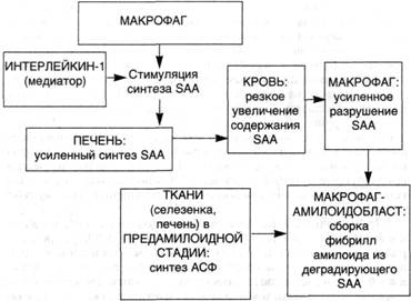 ▲ образование амилоидных фибрилл из легких цепей плазматическими, миеломными (опухолевыми) клетками и макрофагами в условиях нарушенной деградации моноклональных легких цепей или появления легких цепей с особыми структурами ("аминокислотные замены"). При этом между клетками-амилоидобластами — миеломными (плазматическими) и макрофагами — возникает подчиненное механизму амилоидогенеза взаимодействие.