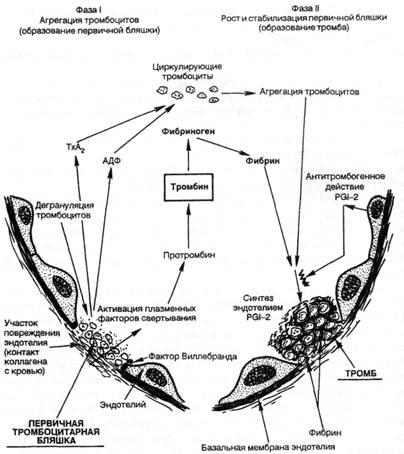 Механизм образования тромба.Инициальным моментом тромбообразования является повреждение эндотелия. Тромб образуется при взаимодействии тромбоцитов (кровяных пластинок), поврежденного эндотелия и системы свертывания крови (коагуляционного каскада).