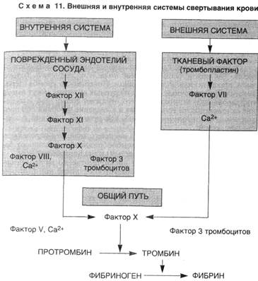 4. Активация процесса свертывания крови, или коагуляционного каскада (схема 11), с помощью следующих механизмов: