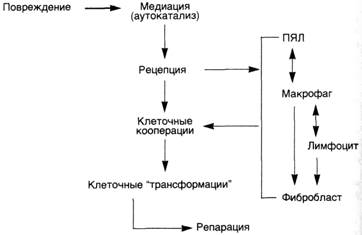 Клеточные медиаторы — лейкокины, монокины (интерлейкин-1), лимфокины (интерлейкин-2) и фиброкины — являются локальными регуляторами кооперации клеток на "поле" воспаления — ПЯЛ, макрофага, лимфоцита и фибробласта [Серов ВВ., Шехтер А.Б., 1981]. Другими словами, клеточные медиаторы определяют последовательность и долю участия в воспалении фагоцитарной и иммунной систем, с одной стороны, и системы соединительной ткани — с другой.