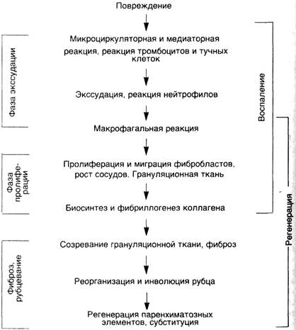 Каждая из фаз причинно-следственной цепи подготавливает и "запускает" следующую, определяя интенсивность и распространенность ее реализации. Непрерывно осуществляемая на каждом этапе ауторегуляции с помощью межклеточных взаимодействий обеспечивает в целом адекватность воспаления — повреждению, регенерации — воспалению, фиброзного этапа регенерации— ее пролиферативному этапу. Конечной целью этой "автоматической" реакции является ликвидация повреждения, т.е. максимальное анатомическое восстановление ткани с минимальными в данных условиях функциональными потерями.
