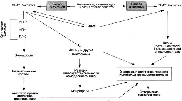Реакции, обусловленные Т-лимфоцитами.Активированные СD4+Т-хелперы участвуют в активации CD8+ ЦТЛ. Развитие реакций, опосредованных Т-лимфоцитами, происходит при встрече лимфоцитов реципиента с антигенами HLA донора. Полагают, что наиболее важными иммуногенами являются дендритические клетки в донорских органах. Т-клетки хозяина встречаются с дендритическими клетками в пересаженном органе, а затем мигрируют в регионарные лимфатические узлы. Предшественники СШ+ЦТЛ (прекиллеры Т-клеток), обладающие рецепторами к HLA-антигенам I класса, дифференцируются в зрелые ЦТЛ. Процесс дифференцировки сложен и не совсем понятен. В нем участвуют антигенпредставляющие клетки, Т-лимфоциты и цитокины ИЛ-2, ИЛ-4 и ИЛ-5. Зрелые ЦТЛ лизируют пересаженную ткань. Кроме специфических ЦТЛ, образуются лимфокинсекретирующие СО4+Т-лимфоциты, которые играют исключительно важную роль в отторжении трансплантата. Как и при замедленной реакции гиперчувствительности, активированные СО4+Т-лимфоциты выделяют цитокины, вызывающие повышение сосудистой проницаемости и местное скопление мононуклеарных клеток (лимфоцитов и макрофагов). Считают, что ГЗТ, проявляющаяся повреждением микрососудов, ишемией и деструкцией тканей, является наиболее важным механизмом деструкции трансплантата. Более вероятно, однако, что относительная важность цитотоксичности, связанной с СБ8+Т-лимфоцитами, по сравнению с реакциями, обусловленными СО4+Т-лимфоцитами, зависит от природы несоответствия HLA донора и HLA реципиента.