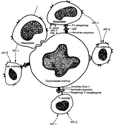 В защите от опухоли имеют значение реакции клеточного и гуморального иммунитета (рис. 6). Основными клетками, участвующими в противоопухолевой иммунной защите, являются специфические цитотоксические Т-лимфоциты, способные распознать мембраносвязанные опухолевые антигены (см. лекцию 20), а также антигены, относящиеся к антигенам I класса основного комплекса гистосовместимости; натуральные Т-киллеры (NK-клетки), вызывающие деструкцию опухолевых клеток предварительной сенсибилизации. Лизис осуществляется за счет непосредственного связывания с опухолевыми клетками или через Fc-фрагменты противоопухолевых антител; макрофаги осуществляют как неспецифическое повреждение опухолевых клеток через выделение а-ФНО и других факторов, так и специфическое иммунное повреждение путем присоединения к Fc. фрагментам противоопухолевых антител и через активацию Т-лимфоцитов, выделяющих 7-интерферон и другие цитокины.