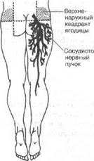 Для внутримышечных инъекций пользуются шприцем и иглой длиной 8-10 см. В ягодичной области используют только верхненаружную её часть, наиболее отдалённую от седалищного нерва и крупных кровеносных сосудов. Мысленно разделяют ягодицу на четыре части (квадранты); инъекцию проводят в верхненаружный квадрант в верхненаружной его части приблизительно на 5-8 см ниже уровня гребня подвздошной кости (рис. 11-8).