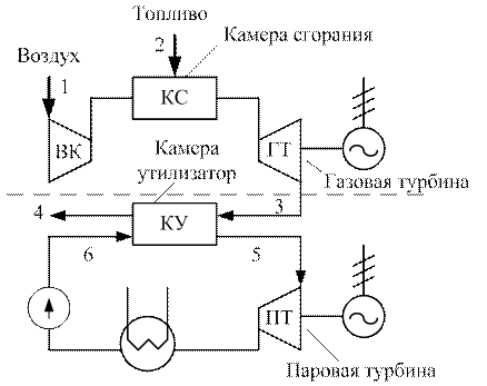 В котле-утилизаторе КУ за счет тепла продуктов сгорания 3вода 6 превращается в пар 5,поступающий в паровую турбину ПТ, на одном валу с которой находится второй электрический генератор. Такого рода парогазовая установка позволяет использовать (утилизировать) тепло отработавших в газовой турбине продуктов сгорания 3. Охладившиеся в котле-утилизаторе продукты сгорания 4выбрасываются наружу. Отработавший в паровой турбине ПТ пар поступает, как обычно, в конденсатор, в котором отдает тепло охлаждающей воде, превращается в конденсат и затем с помощью питательного насоса 6снова поступает в котел-утилизатор.