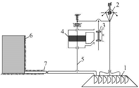 1- турбина; 2- регулятор скорости – центробежный маятник (ЧЭ); 3- золотник; 4- управляющий серводвигатель; 5- заслонка – орган управления; 6- водоем; 7- трубопровод
