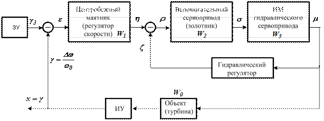 Угловая скорость вращения вала гидротурбины зависит от величины перемещения штока серводвигателя.